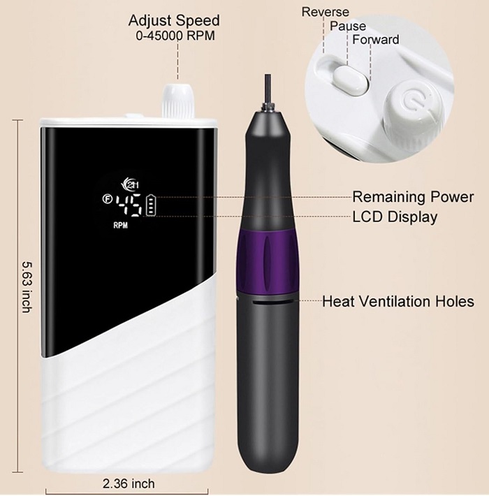 Επαγγελματικός, επαναφορτιζόμενος τροχός μανικιούρ-πεντικιούρ με βάση στήριξης. Διαθέτει ρυθμιζόμενη ταχύτητα, λειτουργία μειωμένου θορύβου και δονήσεων και εργονομικό σχεδιασμό για άνετη πολύωρη χρήση.