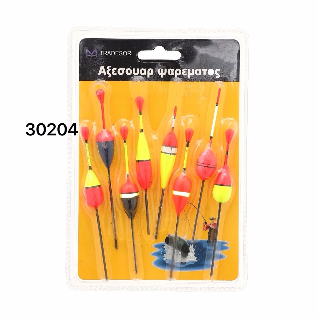 Σετ φελλοί ψαρέματος σε διάφορα μεγέθη και σχήματα.