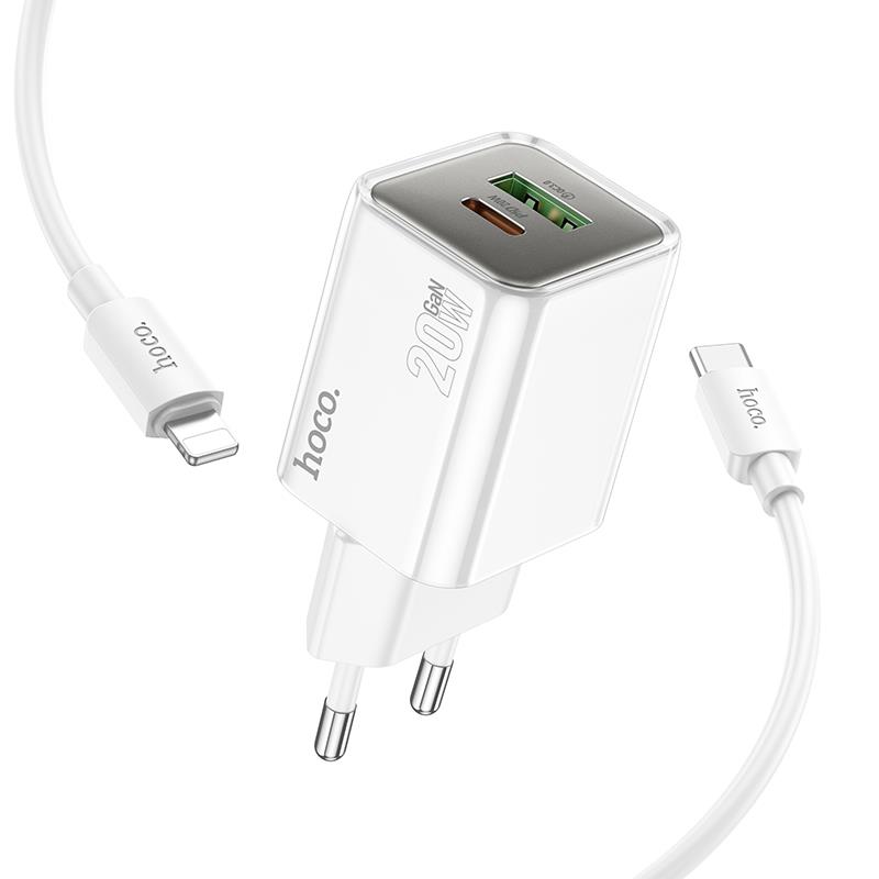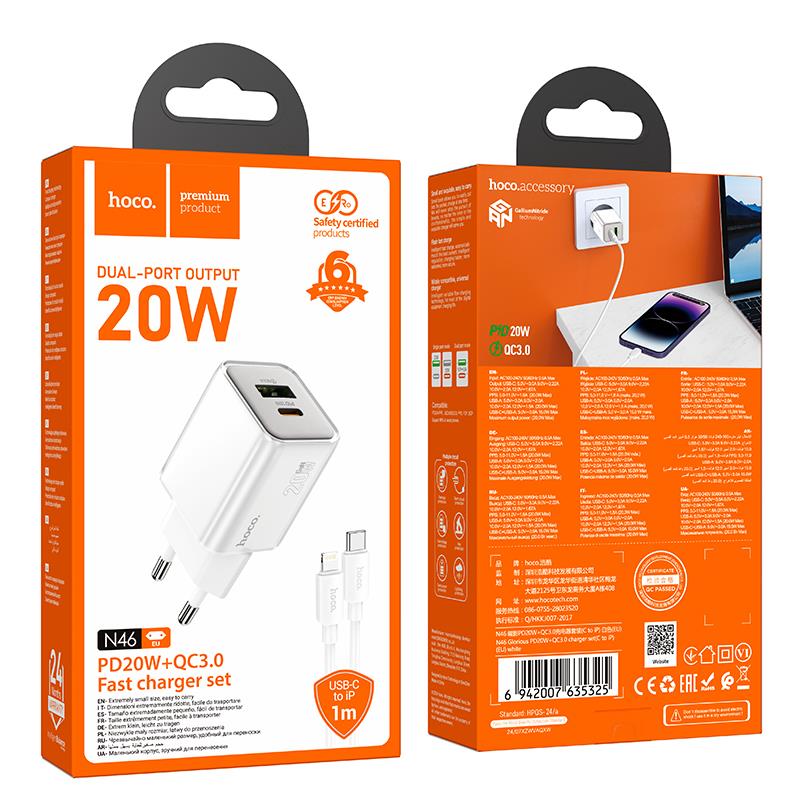 Material: flame retardant PCOutput: USB-C: 20W (PD/QC/FCP/AFC)USB-A: 20W (QC/FCP/AFC); USB-C+USB-A=5V/3AEU plugSize: 76.8*35.6*30.5mmTotal weight: 69gSet with 1m C to iP charging cable