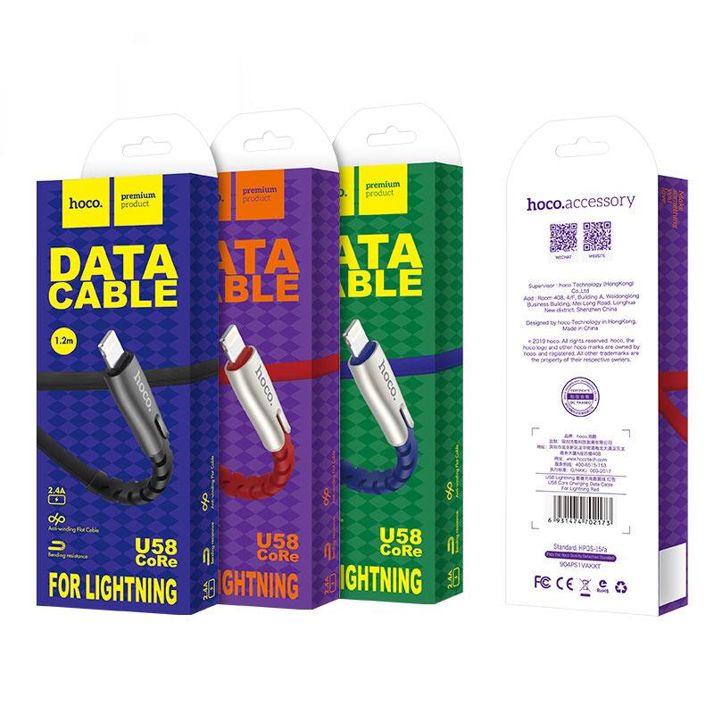 U58 Core USB to Lightning charging data cable 1.2m current 2.4A nickel-zinc alloy connectors and TPE braid1. Cable length: 1.2 meters. Weight: 33g.2. Cable support charging and data transmission, the maximum current is about 2.4A.3. Cable materials: nickel-zinc alloy connectors + TPE braid.4. Wire core specification: 118 four core oxygen-free tinned copper OD=6.0*2.5mm.