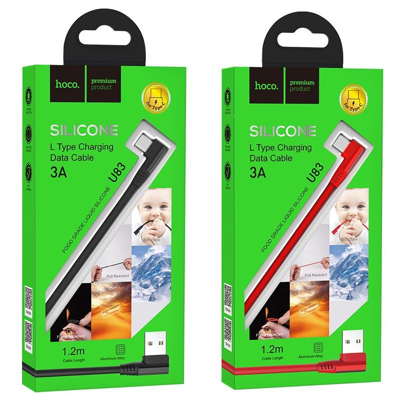U83 Puissant USB to Type C charging data cable 1.2m silicone braid 90 degree elbow design1. Length 1.2m, weight 26g.2. Support charging and data transmission, the maximum current is about 2.4A.3. Food grade silicone. 90 degree elbow design.hoco u83 puissant silicone charging cable for lightning connectors