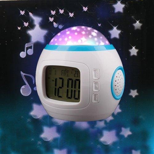 Μουσικό Ρολόι-ξυπνητήρι με projector για προβολή αστεριών σε διάφορους χρωματισμούς στο ταβάνι!Με 4 διαφορετικούς χαλαρωτικούς ήχους θάλασσας και 6 διαφορετικές χαλαρωτικές μελωδίες.Πραγματικά εντυπωσιακό ρολόι, με οθόνη LCD και εξαιρετικά εύκολο στη χρήση. Διαθέτει και θερμόμετρο και ημερολόγιο. Λειτουργεί με 3 ΑΑΑ μπαταριες (Δεν περιλαμβάνονται στη συσκευασία)