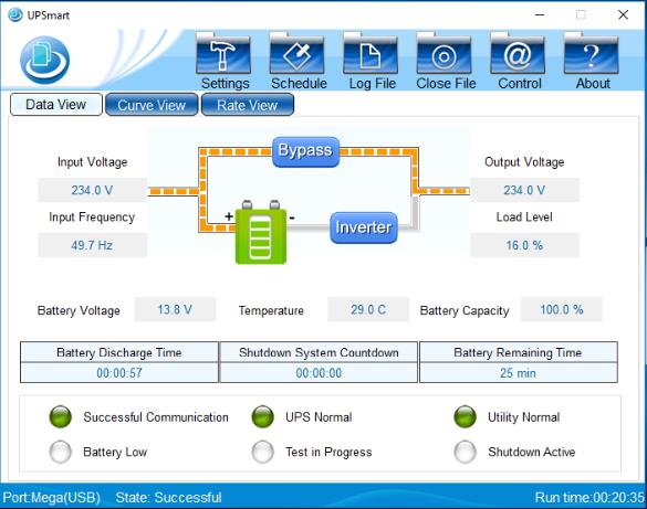 iSmartView SoftwareSpecifications:UPS type: Line InteractiveInput: AC 220V ± 25%, 50/60 Hz± 10%Output: AC 220V ± 10%, 50/60 Hz ± 0.5% (on battery)Switching time: No more than 10 msBackup time: Up to 20 mins (depends of the load)Battery: 151mm x 65mm x 95mm, sealed lead-acid 12V/8Ah x 1 pcsCharge time: Up to 12 hoursSockets: 2 x Schuko output (CEE 7/4) 1 x RS232/USB communication port 2 x RJ11/RJ45Operating Conditions: 0 degrees C – 40 degrees C, at humidity 10-90% RH non condensingPower: 650VA (390 W) – 850VA (510 W)Dimensions: 100mm x 280mm x 140mmProduct weight: 4.3kgΠιστοποιητικό CEΕγγύηση 12 μήνες η μπαταρία, 2 χρόνια τα μηχανικά.