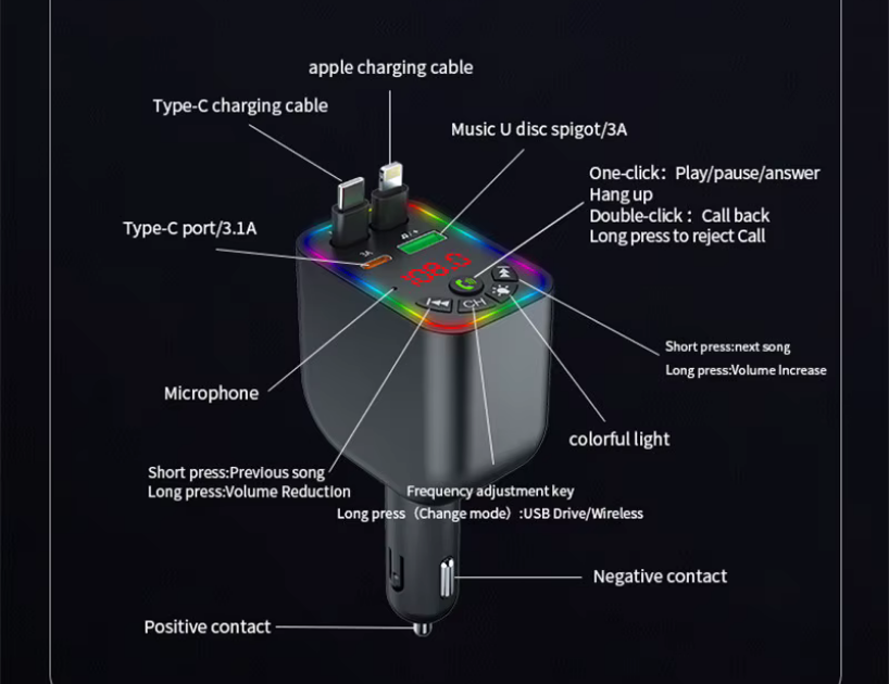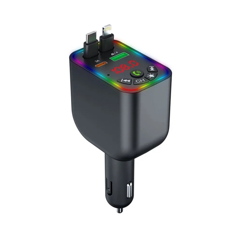 Transmitter αυτοκινήτου Bluetooth με 2 ενσωματωμένα πτυσσόμενα καλώδια φόρτισης Type-C & Lightning, για εύκολη φόρτιση των συσκευών σας χωρίς να χρειάζεται να μεταφέρετε μαζί σας ξεχωριστά καλώδια.