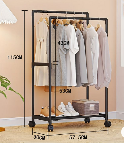 Τροχήλατη κρεμάστρα δαπέδου διπλή με ράφι παπουτσιών, ιδανική ως έπιπλο εισόδου ή για την οργάνωση των ρούχων στο δωμάτιό σας . Διαστάσεις: 115 x 57.5 x 30 cm.