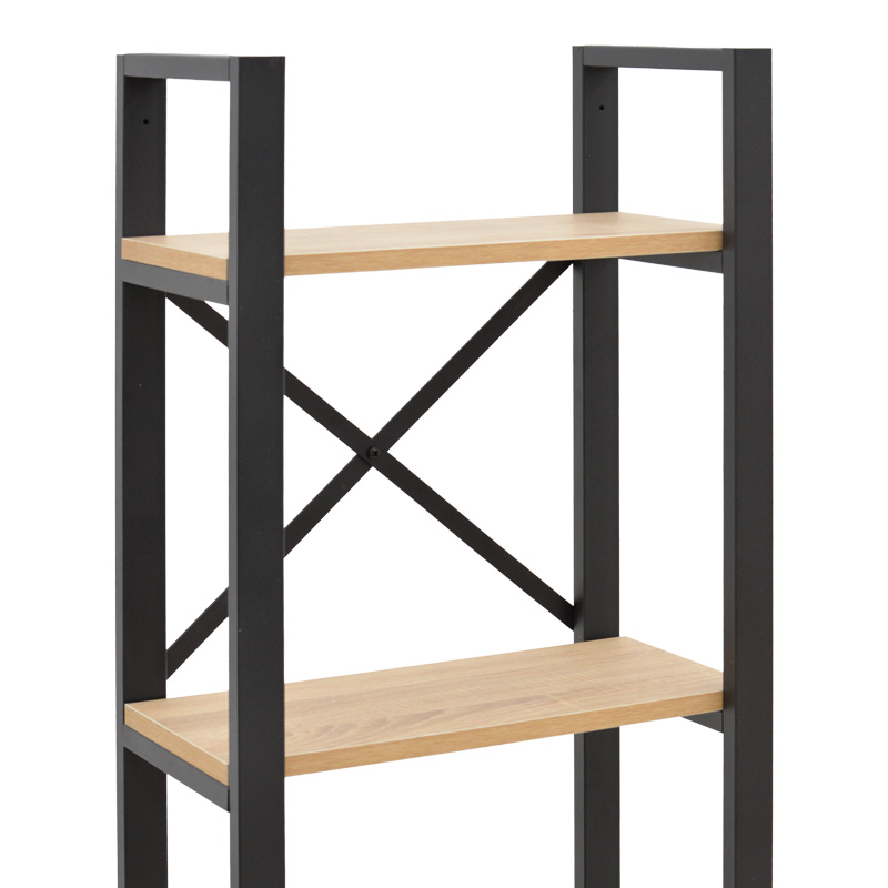 - Τα ράφια είναι σε χρώμα oak και ο σκελετός σε μαύρο.