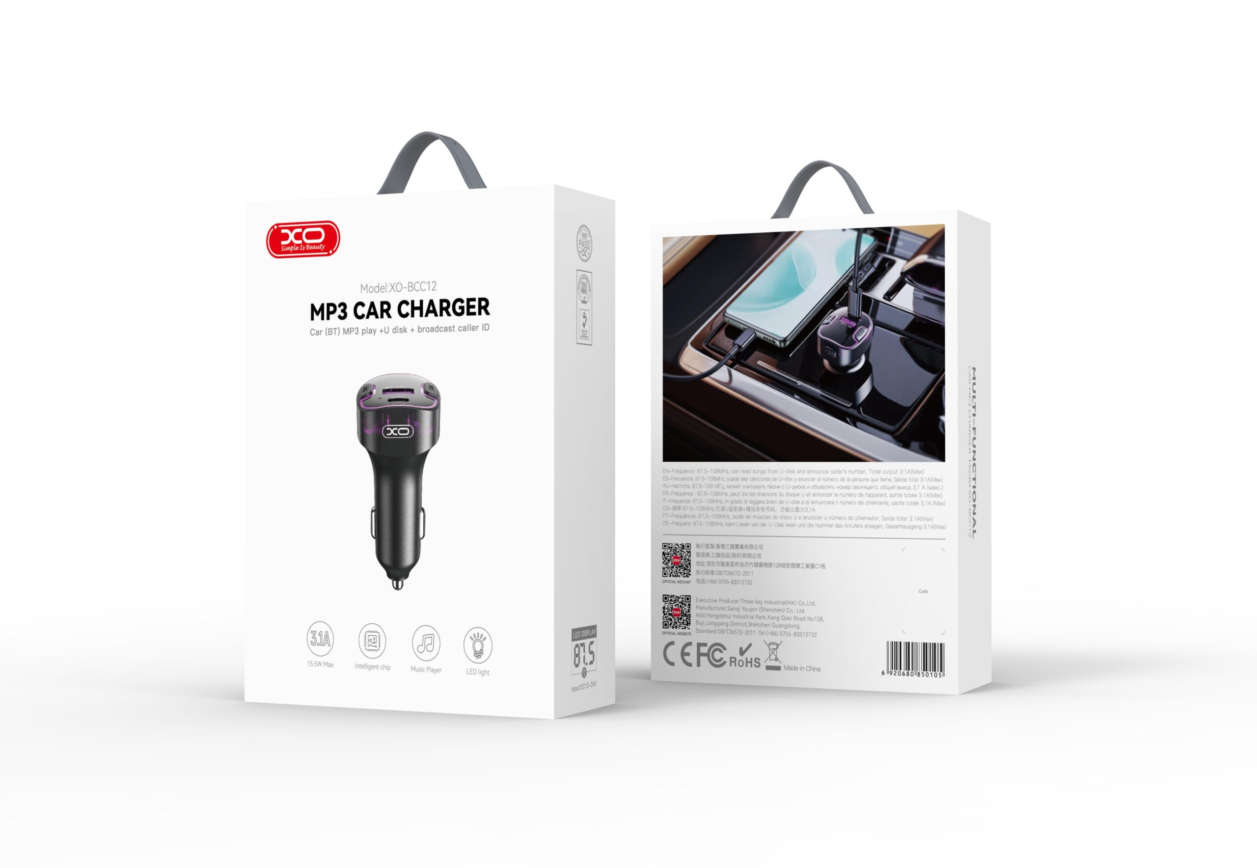 XO-BCC12 (5V 3.1A)Όνομα Bluetooth: XO-BCC12Έκδοση Bluetooth: Bluetooth V5.3Είσοδος: DC12-24VΈξοδος: USB-A: 5V/3.1A, μπορεί να διαβάσει τραγούδια από μονάδες flash USB.Τύπος-C: 5V/3.1AΣυνολική έξοδος: 5V/3,1AΣυχνότητα FM: 87,5-108 MHZΑπόσταση μετάδοσης: 5-10μΥλικό: ABSΜήκος * πλάτος * ύψος: 39,2 * 35 * 73,7 mm (ανοχή: ± 0,5 mm), βάρος: 24,4 GΧρωμα μαυρο