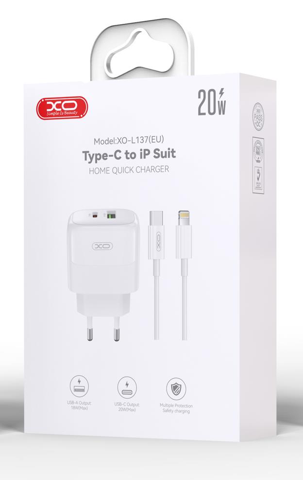 XO L137 ΦΟΡΤΙΣΤΗΣ PD20W/QC18W, 1 ΘΥΡΑ USB + 1 ΘΥΡΑ PD, ΜΕ ΚΑΛΩΔΙΟ LIGHTNING, ΛΕΥΚΟ