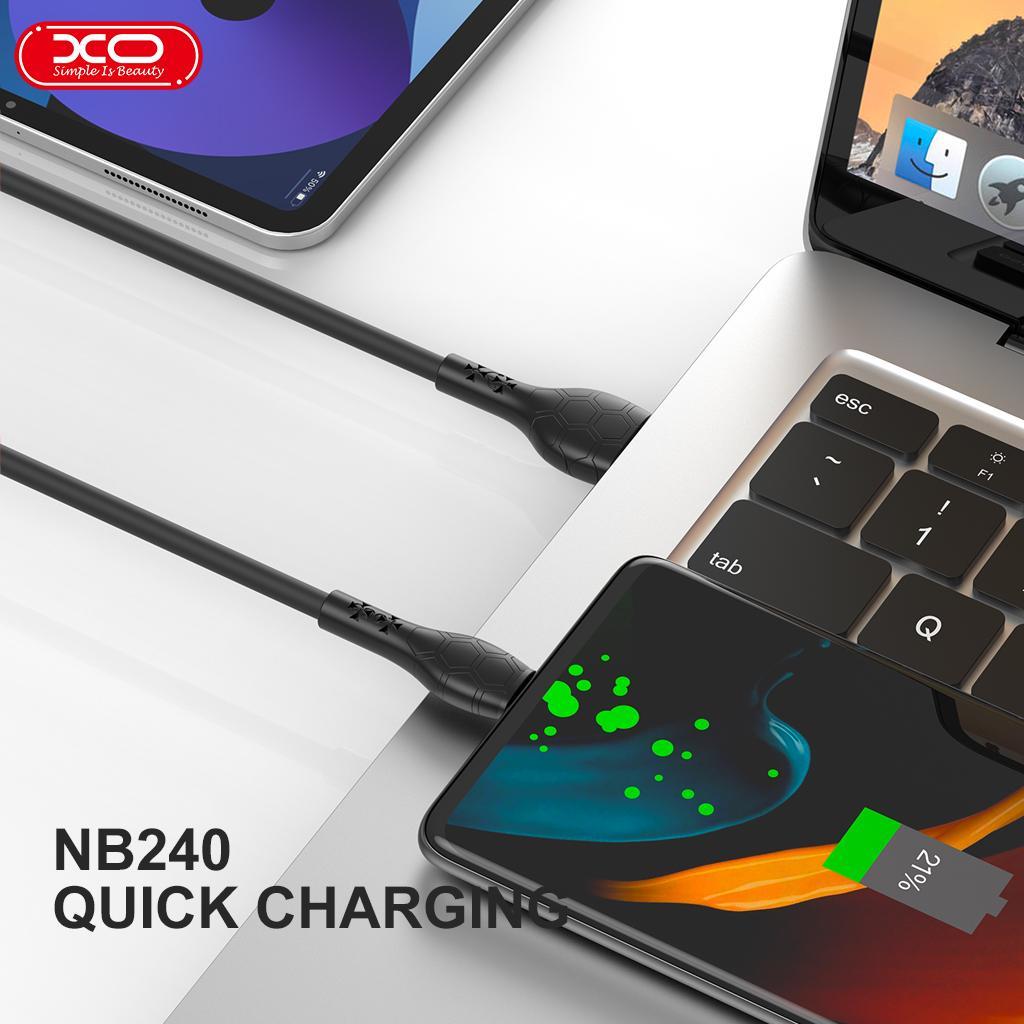 XO-NB240Cable length: 1M, weight: 20grCore: (pure copper 43/0.08BS*2C+16/0.08BS+250D/*2C) OD3.8 PVC covered with PCV anti-silica gel (2.4A)Function: charging + data (480Mbps)